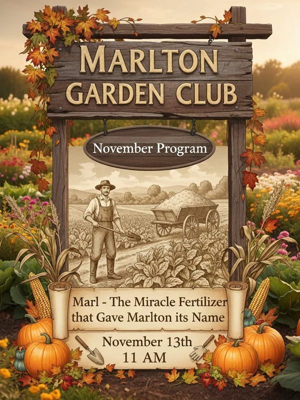 "Marl - The Miracle Fertilizer that Gave Marlton its Name,” presented by Jim Alexander, a writer and historical researcher whose projects have included local railroads, Nike Missile bases, and solid waste management. Currently, his extensive research into marl, its history, the railroads that hauled it, and its use, is pending publication by Stockton University’s South Jersey Culture & History Center. Marlton was in the center of New Jersey’s marl belt. Jim will bring examples of Marl and will discuss how it was mined, transported, and used by farmers, mostly in the late 1800s, as well as its current use.